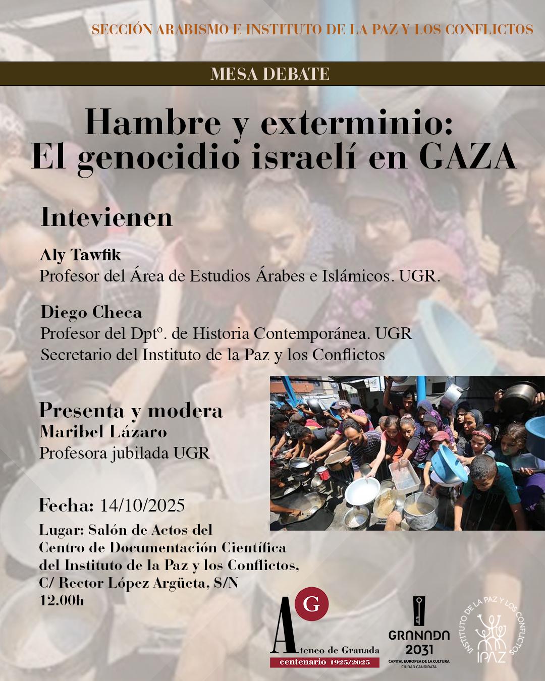 Mesa debate | Hambre y exterminio: el genocidio israelí en Gaza📅 Martes 14 de octubre de 2025🕛 12:00 h📍 Salón de Actos del Centro de Documentación Científica del Instituto de la Paz y los Conflictos, C/ Rector López Argüeta, s/n En el marco de las secciones de Arabismo y del Instituto de la Paz y […]
