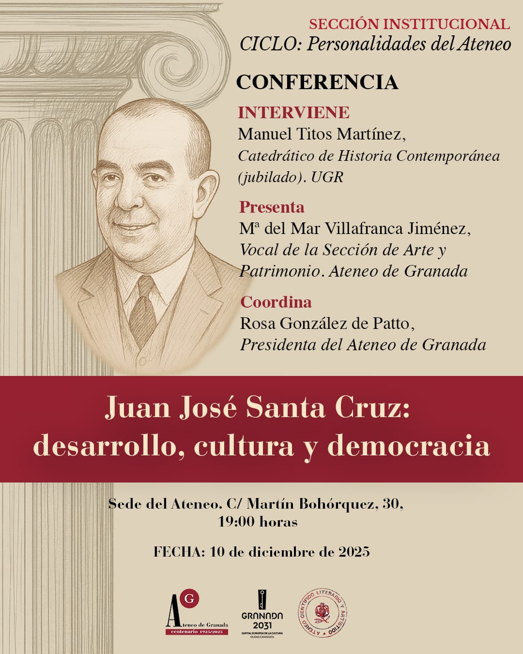 Ateneo de Granada C/Martín Bohórquez, 30, Granada, Granada, SpainLa Sección Institucional del Ateneo de Granada continúa el ciclo “Personalidades del Ateneo” con una conferencia dedicada a la figura de Juan José Santa Cruz, intelectual clave en la articulación del pensamiento cultural y democrático en nuestra ciudad. 📚 “Juan José Santa Cruz: desarrollo, cultura y democracia” Una reflexión sobre su legado, su contribución al […]