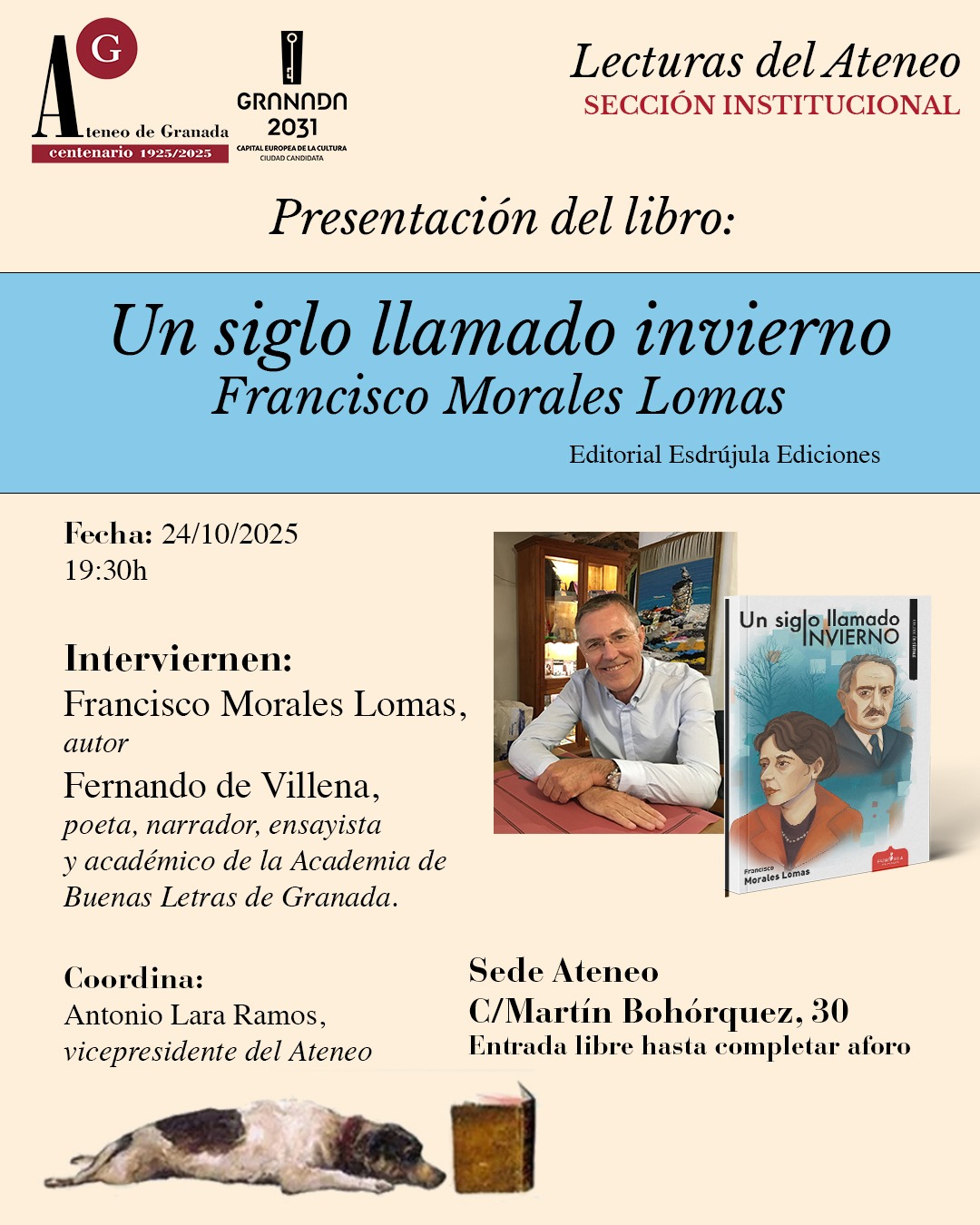 Ateneo de Granada C/Martín Bohórquez, 30, Granada, Granada, Spain📚 Presentación del libro Condición Partisana ✍️ Jesús García Calderón 🗓️ Jueves 16 de octubre de 2025 🕢 19:30 h 📍 Sede del Ateneo de Granada (C/ Martín Bohórquez, 30) 📖 Editorial Entorno Gráfico Ediciones, 2025 En una nueva sesión de Lecturas del Ateneo, recibimos al académico y escritor Jesús García Calderón, quien presentará su […]