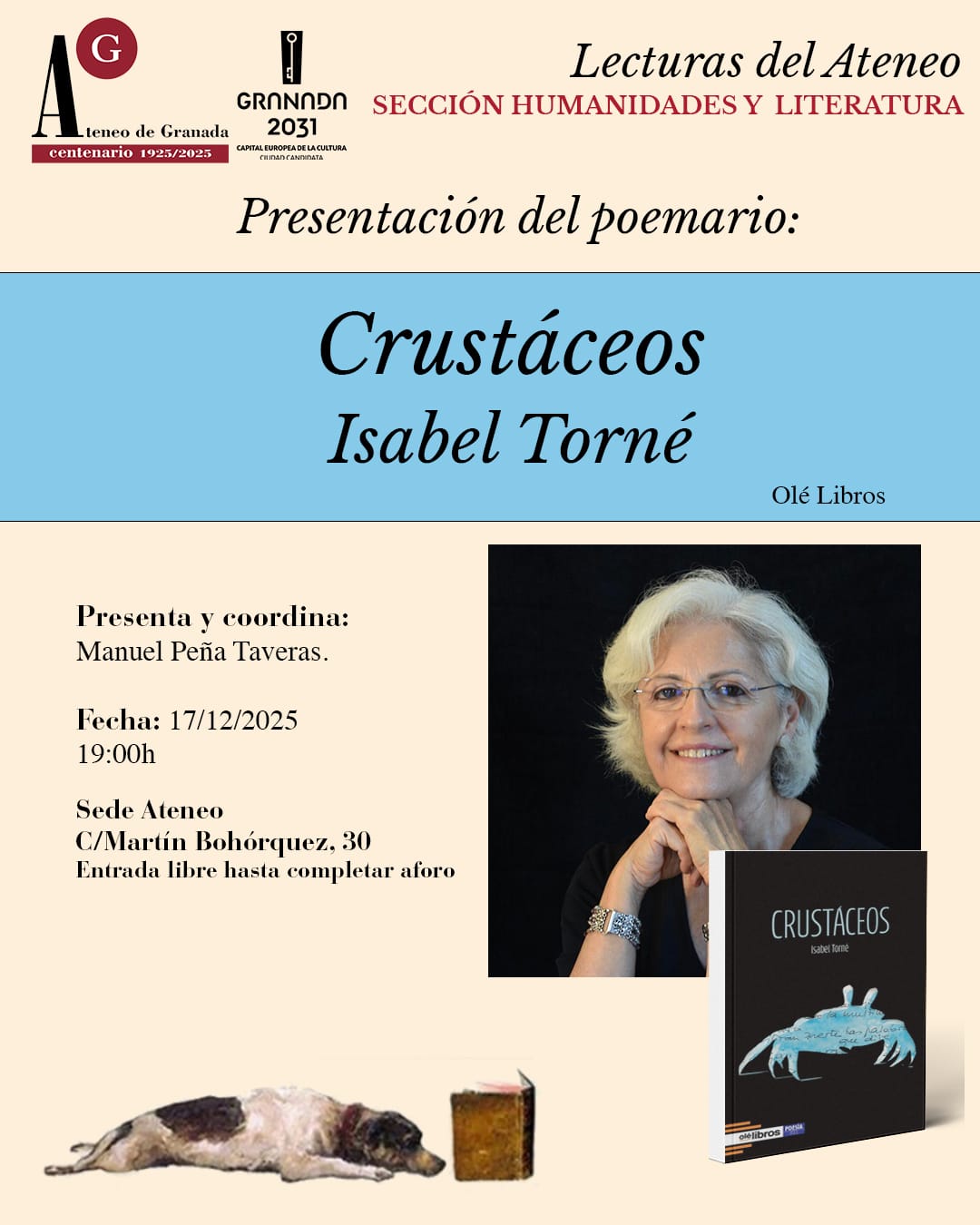 La Sección de Humanidades y Literatura del Ateneo de Granada, dentro del programa Lecturas del Ateneo, invita a la presentación del poemario Crustáceos, de la poeta Isabel Torné. 📖 Presentación […]