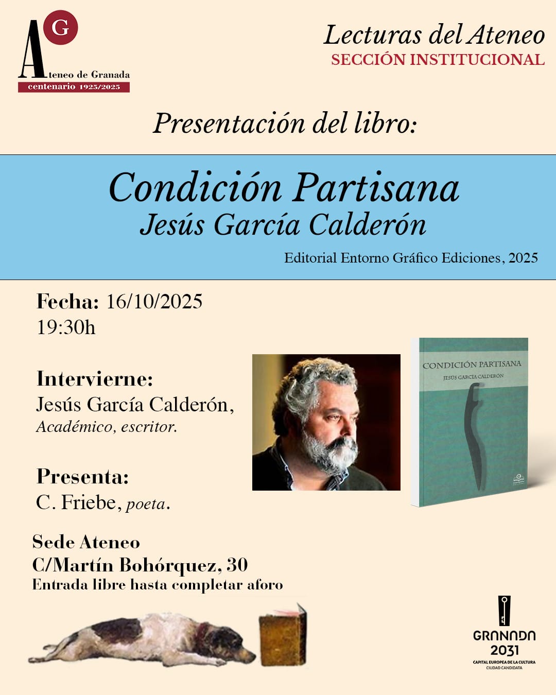Ateneo de Granada C/Martín Bohórquez, 30, Granada, Granada, Spain📚 Presentación del libro Condición Partisana ✍️ Jesús García Calderón 🗓️ Jueves 16 de octubre de 2025 🕢 19:30 h 📍 Sede del Ateneo de Granada (C/ Martín Bohórquez, 30) […]