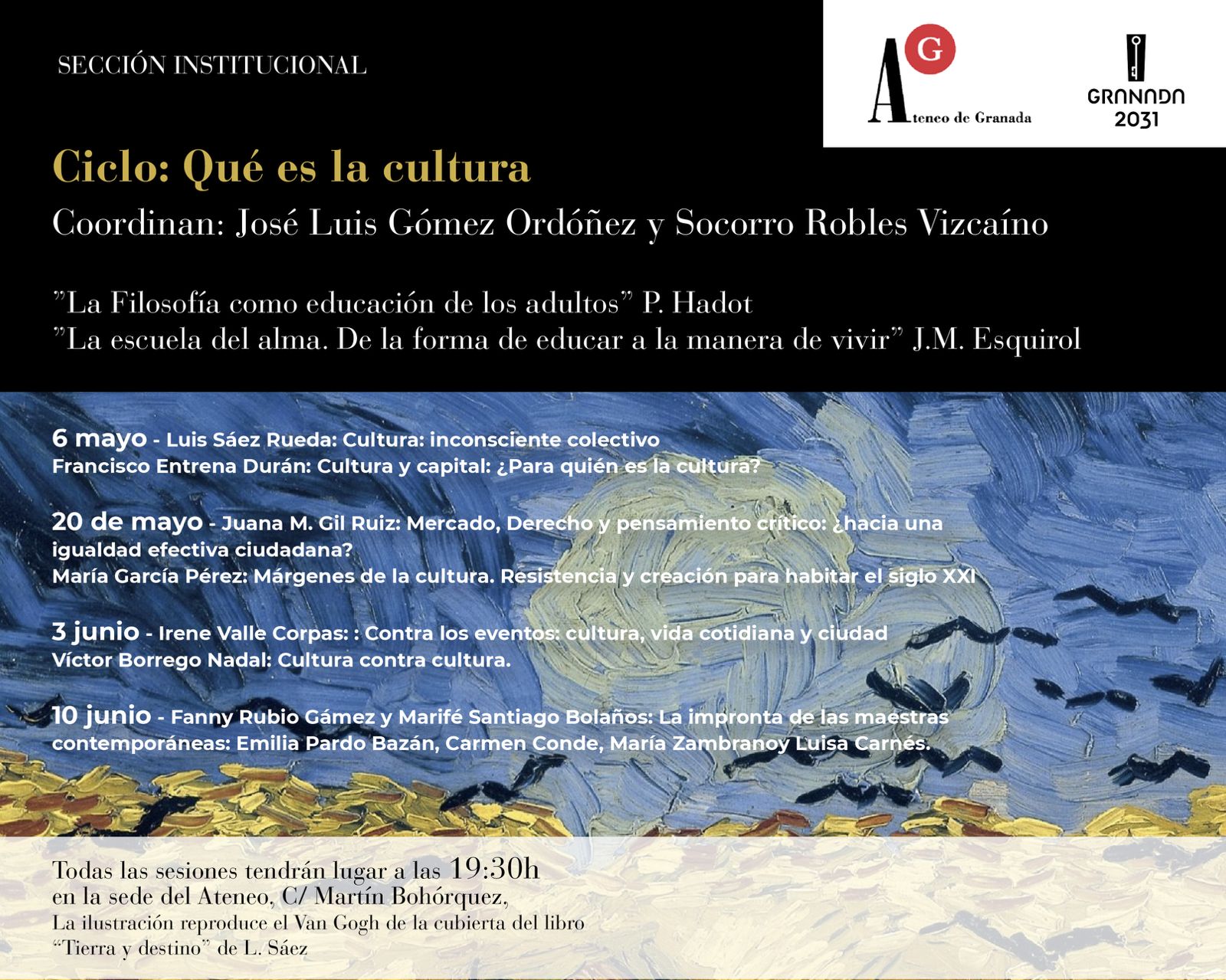 🧠 Ciclo: Qué es la cultura📚 Segunda sesión del ciclo de reflexión filosófica y sociológica sobre el papel de la cultura en nuestra sociedad contemporánea.Organizado por la Sección Institucional del Ateneo de Granada, con la coordinación de José Luis Gómez Ordóñez y Socorro Robles Vizcaíno. 📅 Martes, 20 de mayo de 2025🕢 19:30 h📍 Sede […]
