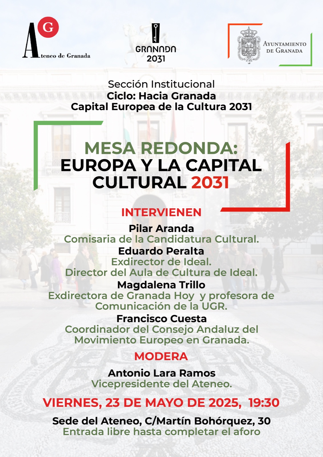 🇪🇺 Mesa Redonda: Europa y la Capital Cultural 2031En el marco del ciclo Hacia Granada, Capital Europea de la Cultura 2031, el Ateneo de Granada abre un espacio de diálogo y reflexión sobre el papel de Europa en los proyectos culturales transformadores. 🗓 Viernes, 23 de mayo de 2025🕢 19:30 h📍 Sede del Ateneo – […]