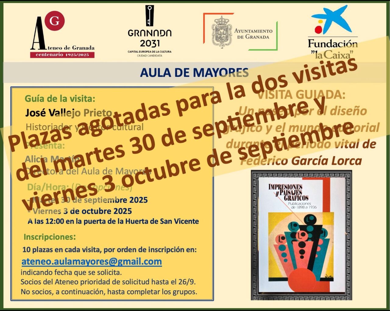 Agradecemos el gran interés por esta actividad guiada por el historiador José Vallejo Prieto, centrada en el diseño gráfico y el universo editorial durante el periodo vital de Federico García Lorca.