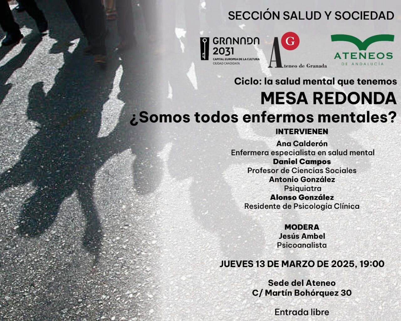 En el marco del ciclo La salud mental que tenemos, el Ateneo de Granada organiza una mesa redonda para reflexionar sobre la percepción y la realidad de la salud mental en nuestra sociedad.