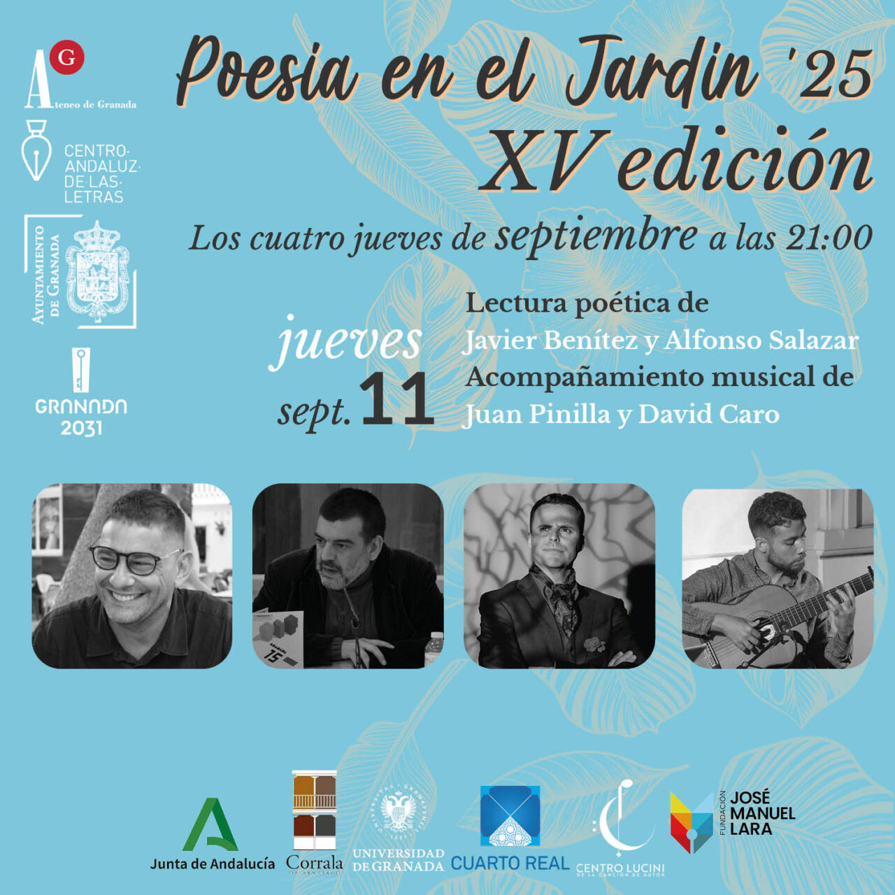 📚 Poesía en el Jardín es una coproducción del Ateneo de Granada, el Centro Andaluz de las Letras y el Ayuntamiento de Granada, en colaboración con la Universidad de Granada, el Cuarto Real, el Centro Lucini y la Fundación José Manuel Lara.