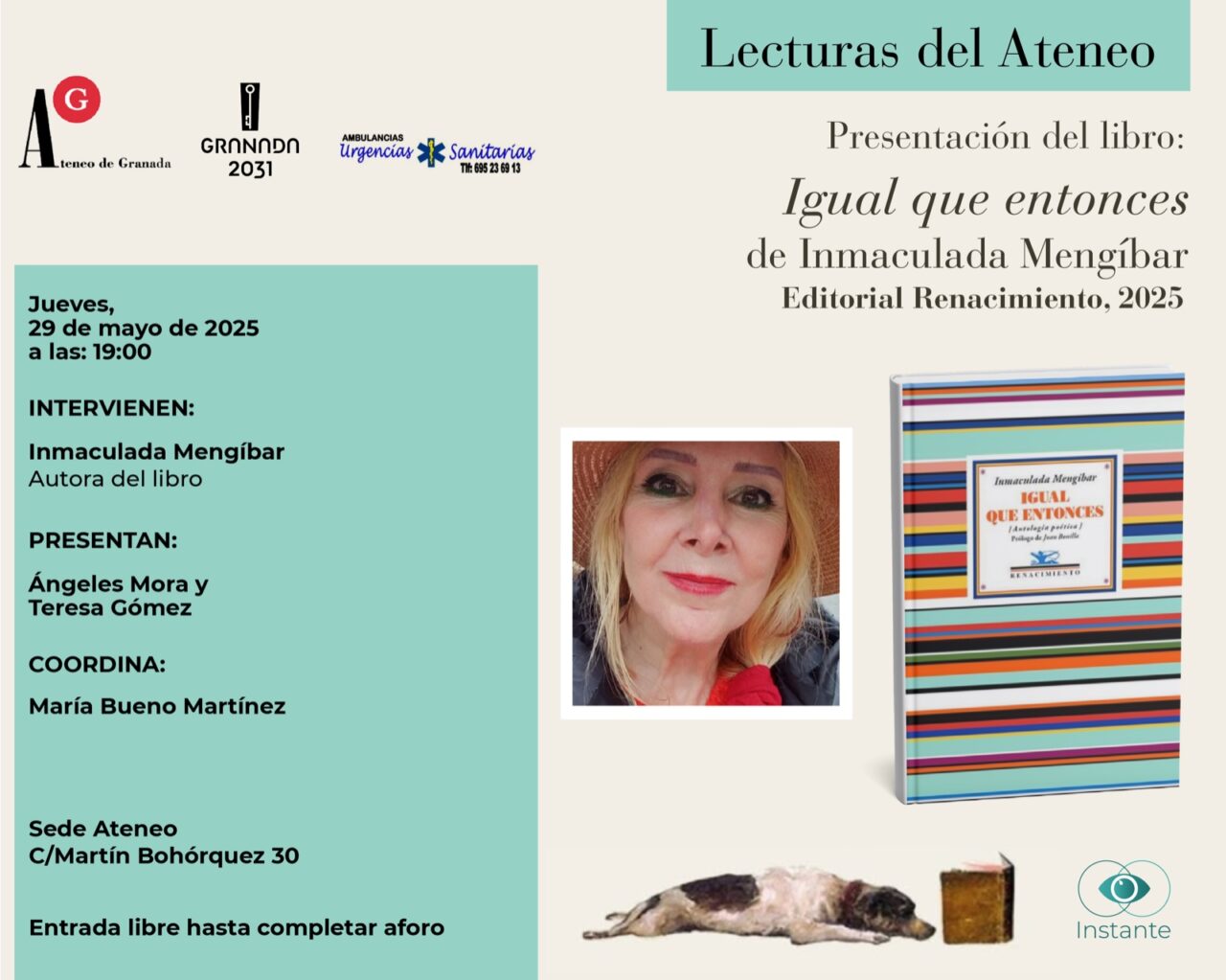 El Ateneo de Granada acoge un nuevo encuentro con la poesía en una cita con la voz personal, íntima y lúcida de Inmaculada Mengíbar, autora de una obra que dialoga con el tiempo, la memoria y los afectos.