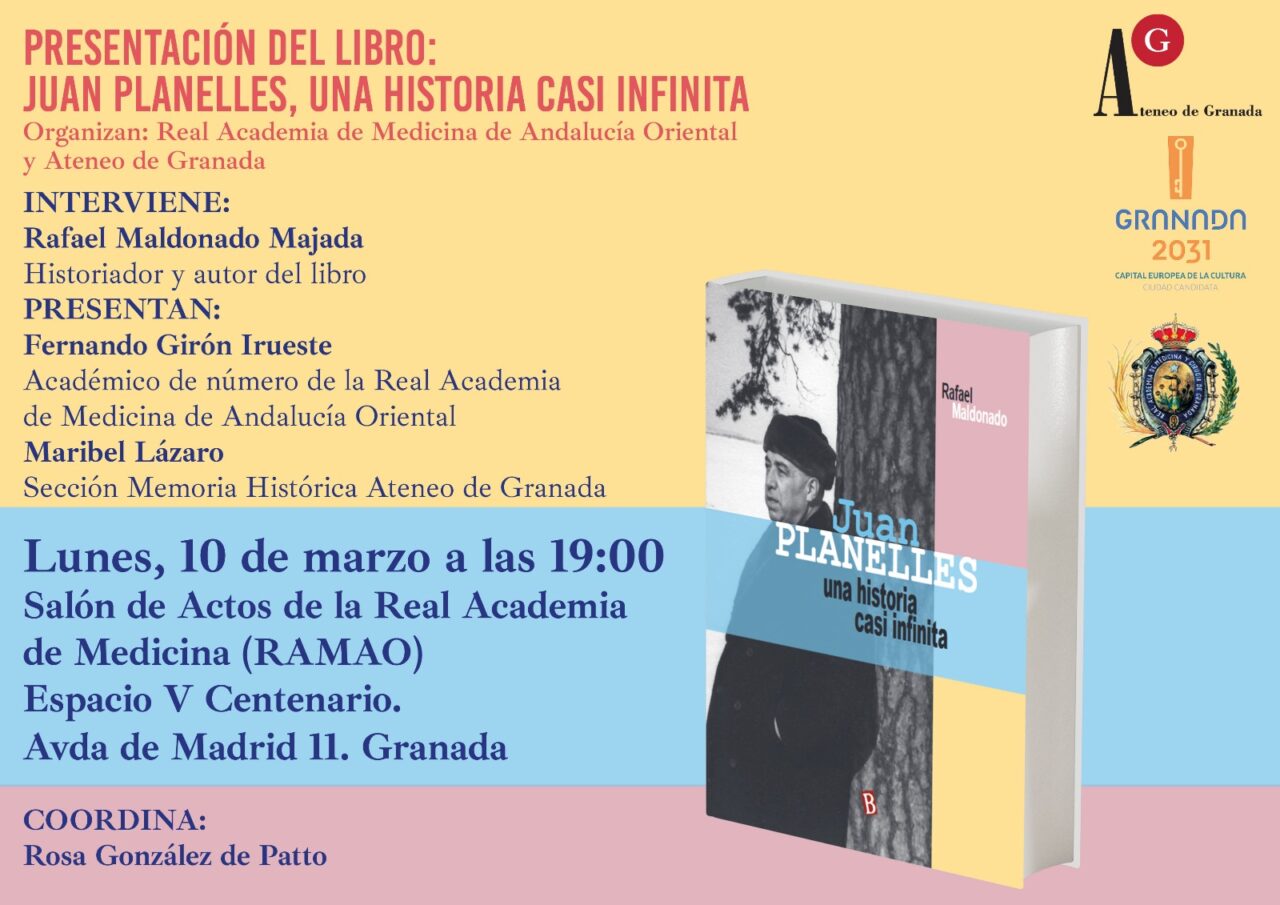 El Ateneo de Granada y la Real Academia de Medicina de Andalucía Oriental te invitan a la presentación del libro Juan Planelles, una historia casi infinita, de Rafael Maldonado Majada.