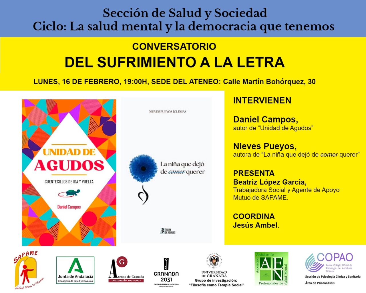 Intervendrán Daniel Campos, autor de Unidad de Agudos, y Nieves Pueyos, autora de La niña que dejó de comer querer, dos obras que abordan el sufrimiento mental desde miradas personales y narrativas distintas, pero complementarias. La sesión será presentada por Beatriz López García, trabajadora social y agente de apoyo mutuo de SAPAME, y coordinada por Jesús Ambel.